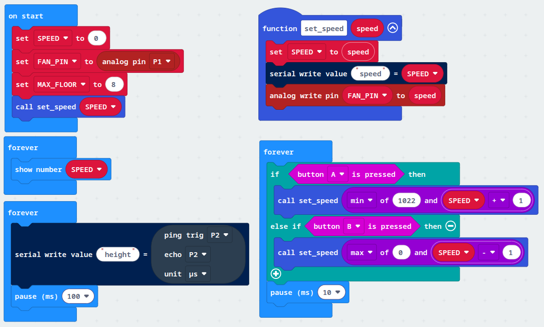 Jednoduchý prográmek pro manuální ovládání větráčku, který se hodí pro zjištění požadovaného výkonu pro určité patro, později i k měření hodnot ze senzoru vzdálenosti. Výška se zobrazí na displayi, případně je k dispozici i na sériové konzoli. Tu zobrazíme kliknutím na “Show data” pod Micro:bitem v editoru makecode.