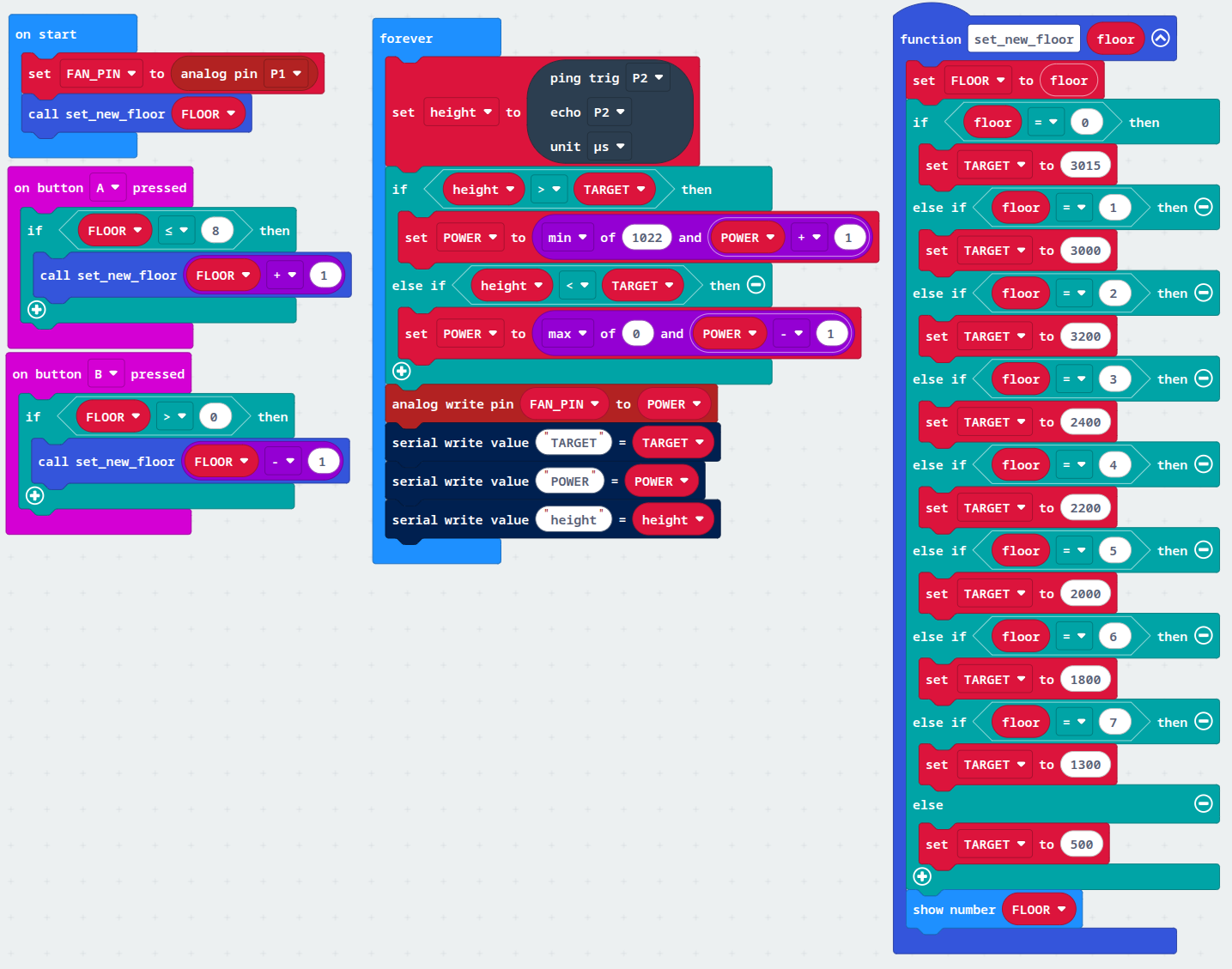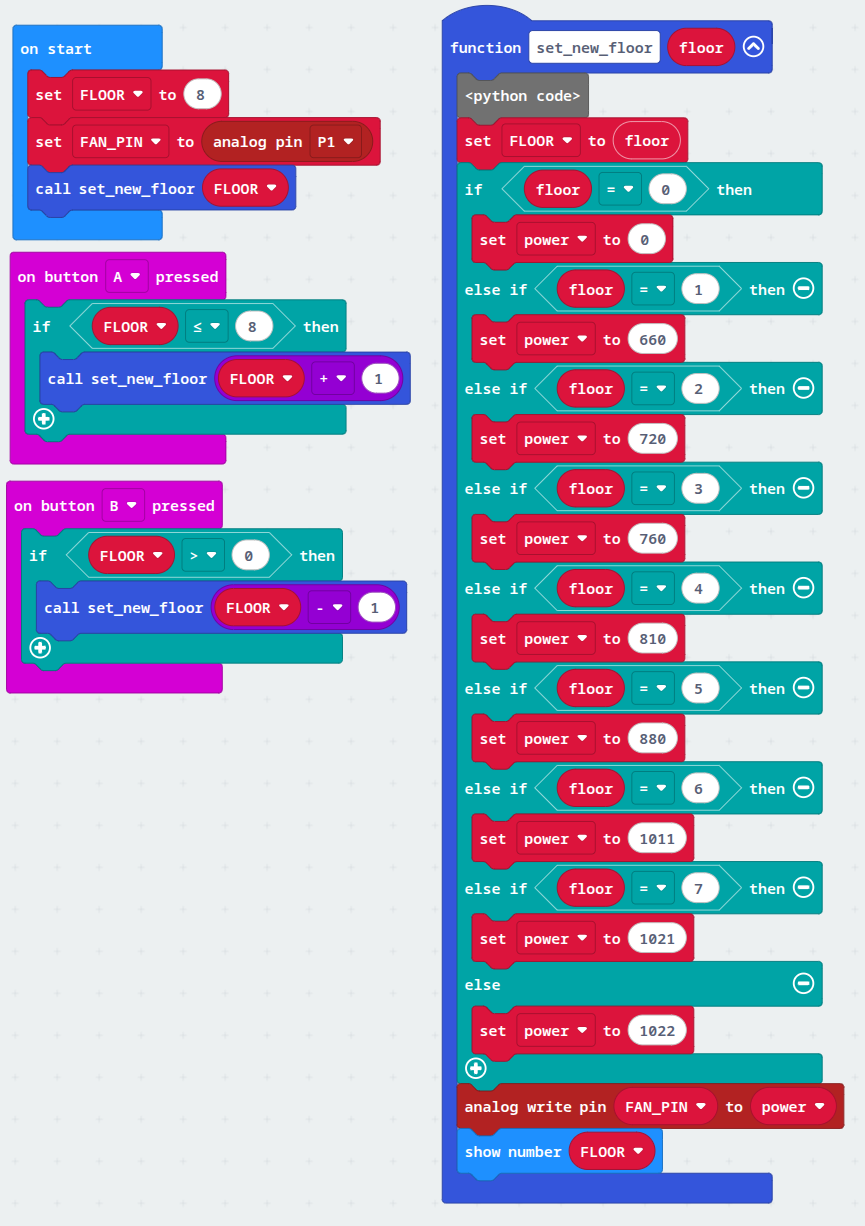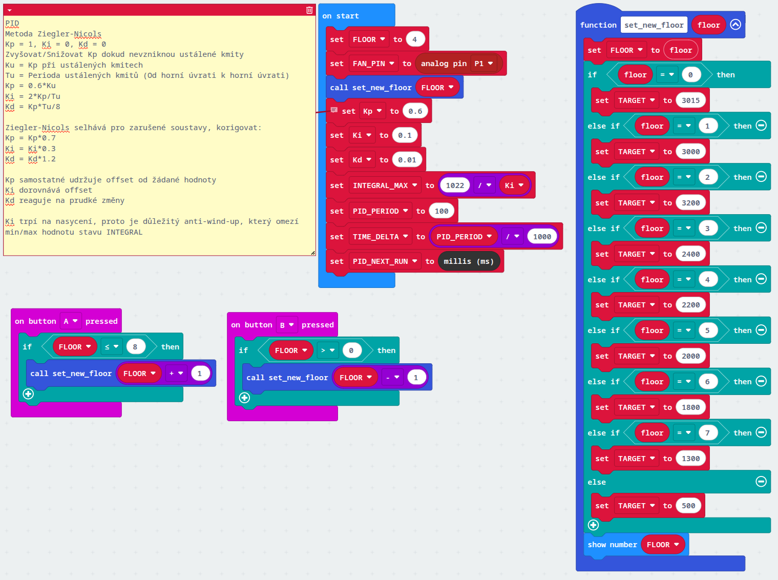 Nyní, když už známe přibližné hodnoty výkonu větráčku můžeme naprogramovat nejjednodušší verzi bez zpětné vazby. Tlačítky “A” a “B” zvolíme patro a pokud jsme nastavili správné hodnoty, měl by se výtah dostat do požadovaného patra.