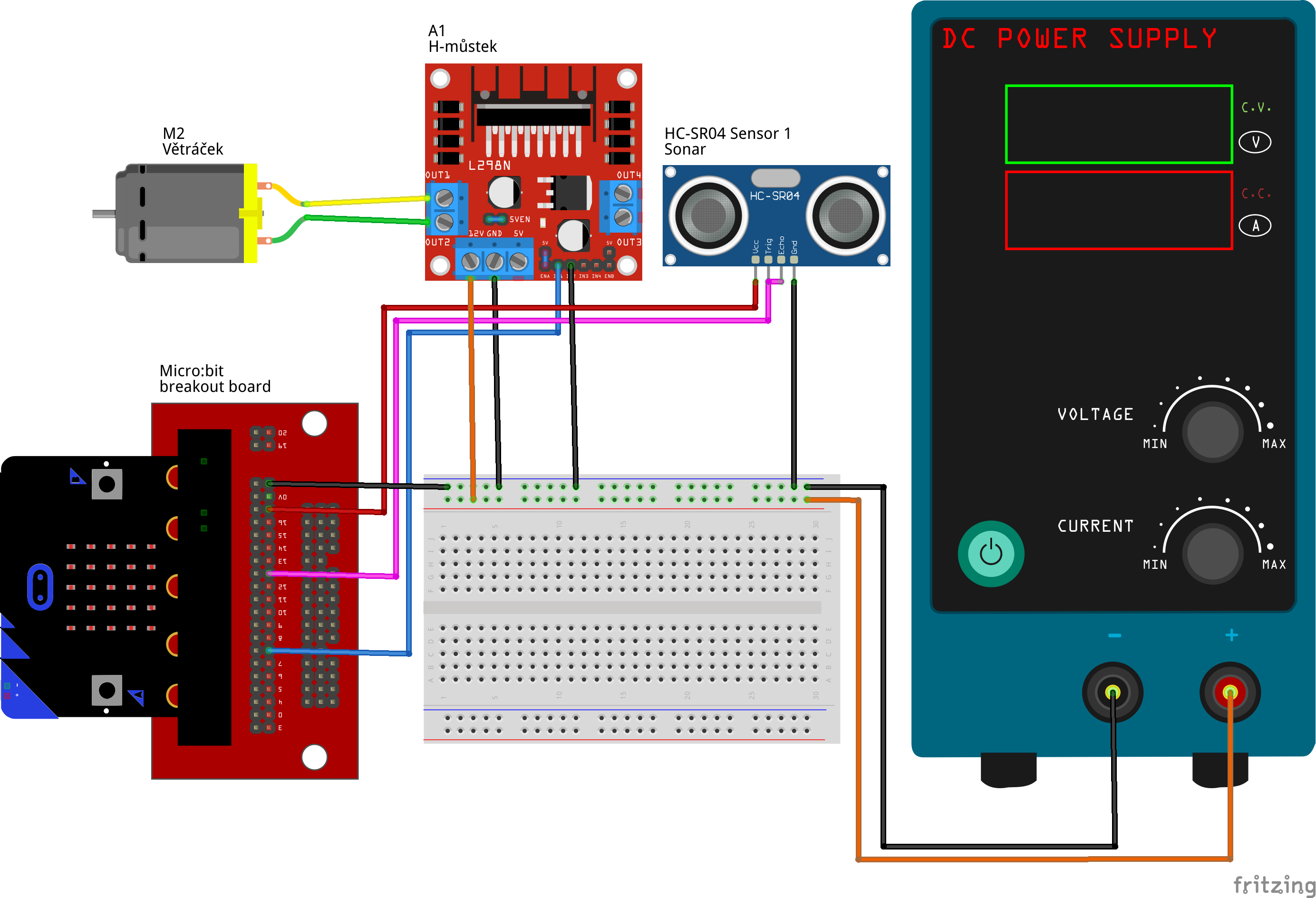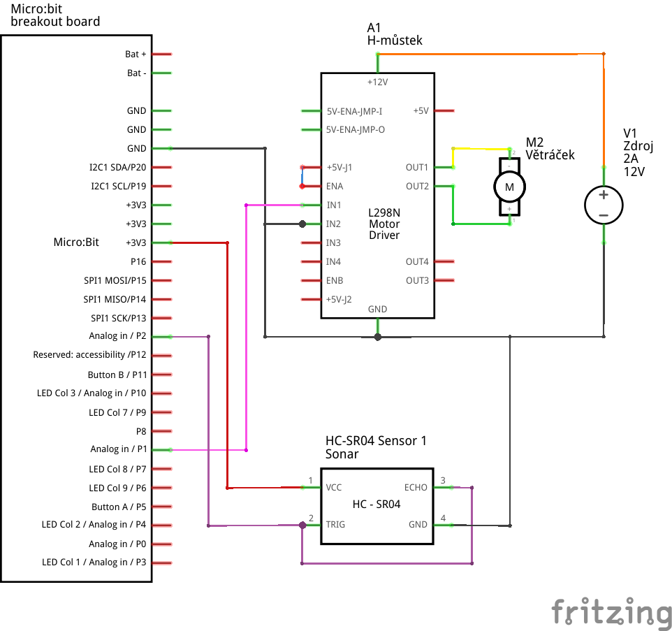 Na vyzkoušení stačí připojit větráček na regulovatelný zdroj a otestovat základní funkci. Cílové zapojení včetně ovládání otáček pomocí Micro:bitu a měřením vzdálenosti pomocí sonaru ve formátu Fritzing zde, či jako obrázky níže: